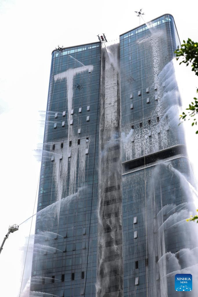 A fire drill for a high-rise building is carried out in Shenzhen, south China's Guangdong Province, June 24, 2025. A high-rise building fire drill aimed at testing the efficiency of high-tech firefighting methods and improving response time was held here on Tuesday. (Xinhua/Mao Siqian)