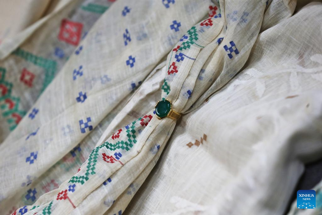 Muslin fabrics are pictured in Dhaka, Bangladesh, on May 25, 2025. Bangladesh is undertaking a national effort to revive its legendary Dhaka muslin fabric, once hailed as "woven air" for its ethereal lightness and intricate craftsmanship during the Mughal era. (Photo by Habibur Rahman/Xinhua)