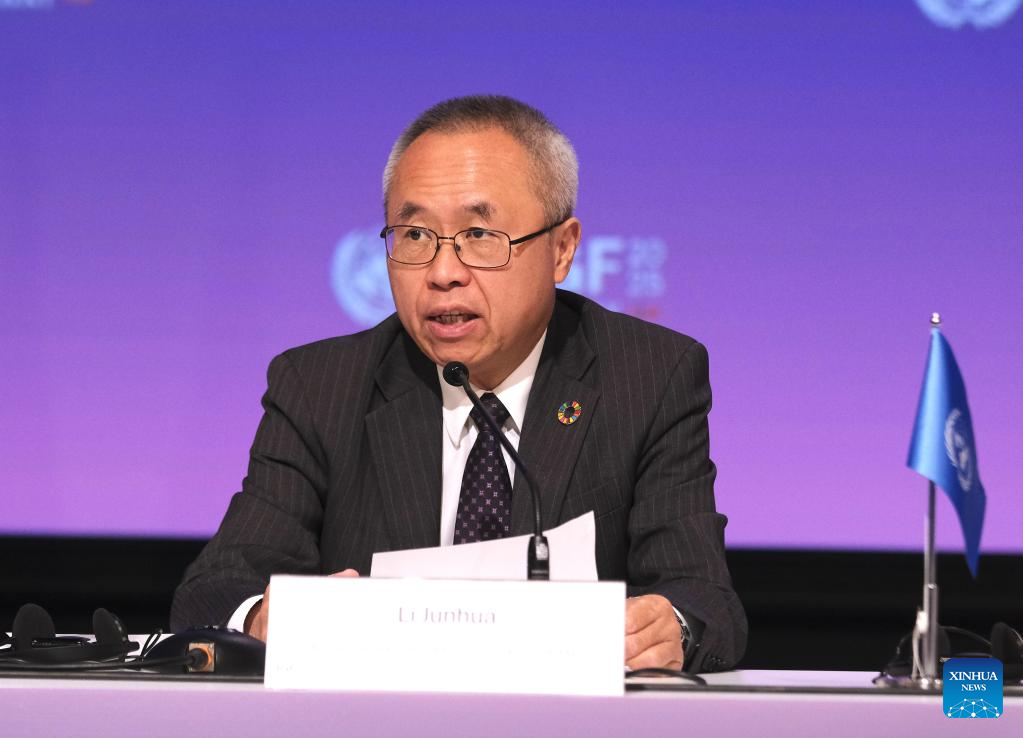 UN Under-Secretary-General Li Junhua attends a press conference during the 20th United Nations Internet Governance Forum in Lillestrom, Norway, on June 24, 2025. United Nations (UN) Secretary-General Antonio Guterres on Tuesday urged the international community to step up efforts to bridge the digital divide by expanding affordable and meaningful Internet access, close the digital skills gap, counter online hate speech, promote information integrity, tolerance and respect, address the concentration of digital power, and foster diversity, transparency, and trust in digital spaces. (Xinhua/Zhang Yuliang)