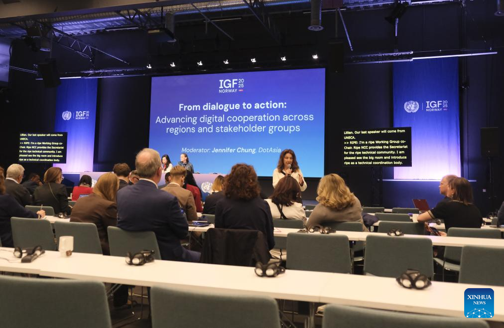A session is held during the 20th United Nations Internet Governance Forum in Lillestrom, Norway, on June 24, 2025. United Nations (UN) Secretary-General Antonio Guterres on Tuesday urged the international community to step up efforts to bridge the digital divide by expanding affordable and meaningful Internet access, close the digital skills gap, counter online hate speech, promote information integrity, tolerance and respect, address the concentration of digital power, and foster diversity, transparency, and trust in digital spaces. (Xinhua/Zhang Yuliang)