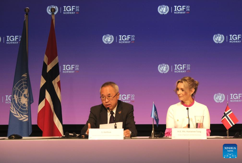 UN Under-Secretary-General Li Junhua (L) and Norwegian Minister of Digitalisation and Public Governance Karianne Tung attend a press conference during the 20th United Nations Internet Governance Forum in Lillestrom, Norway, on June 24, 2025. United Nations (UN) Secretary-General Antonio Guterres on Tuesday urged the international community to step up efforts to bridge the digital divide by expanding affordable and meaningful Internet access, close the digital skills gap, counter online hate speech, promote information integrity, tolerance and respect, address the concentration of digital power, and foster diversity, transparency, and trust in digital spaces. (Xinhua/Zhang Yuliang)