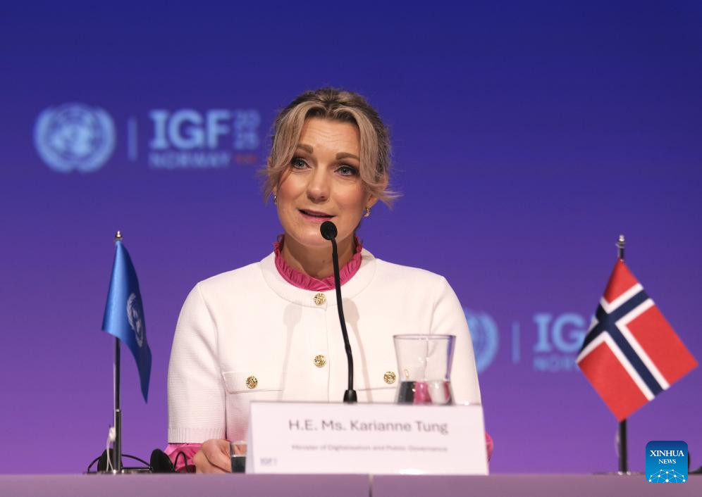 Norwegian Minister of Digitalisation and Public Governance Karianne Tung attends a press conference during the 20th United Nations Internet Governance Forum in Lillestrom, Norway, on June 24, 2025. United Nations (UN) Secretary-General Antonio Guterres on Tuesday urged the international community to step up efforts to bridge the digital divide by expanding affordable and meaningful Internet access, close the digital skills gap, counter online hate speech, promote information integrity, tolerance and respect, address the concentration of digital power, and foster diversity, transparency, and trust in digital spaces. (Xinhua/Zhang Yuliang)