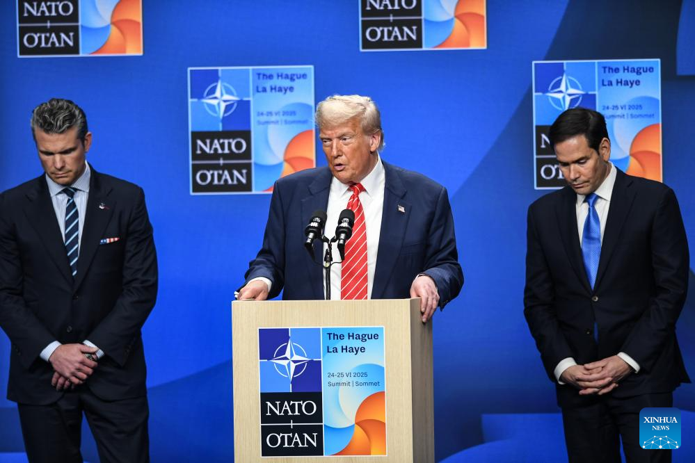 U.S. President Donald Trump (C) attends a press conference following the NATO summit in The Hague, the Netherlands, on June 25, 2025. Trump said here on Wednesday that the United States will hold talks with Iran next week. (Xinhua/Peng Ziyang)
