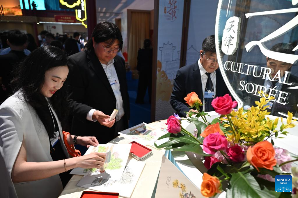 Guests try to make Yangliuqing New Year paintings during the Cultural Soiree of the 16th Annual Meeting of the New Champions, also known as the Summer Davos, in north China's Tianjin Municipality, June 25, 2025. Attendees learned about traditional Chinese culture, tasted characteristic food of Tianjin and enjoyed performances at the event. (Xinhua/Sui Shangjun)