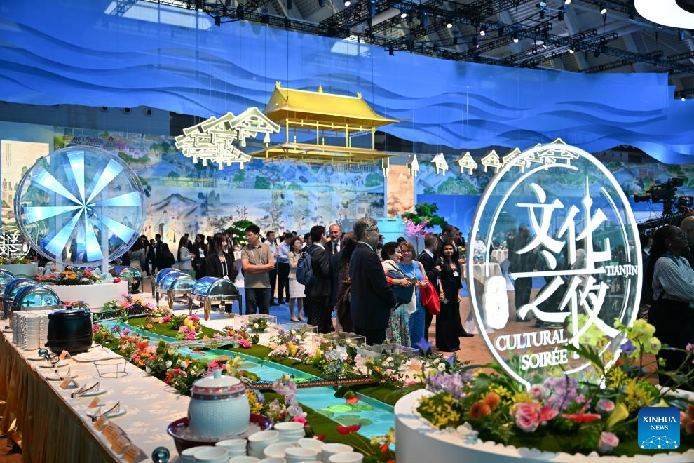 This photo taken on June 25, 2025 shows a view of the Cultural Soiree of the 16th Annual Meeting of the New Champions, also known as the Summer Davos, in north China's Tianjin Municipality. Attendees learned about traditional Chinese culture, tasted characteristic food of Tianjin and enjoyed performances at the event. (Xinhua/Sun Fanyue)