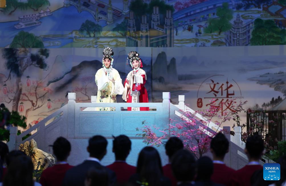 An opera performance is staged during the Cultural Soiree of the 16th Annual Meeting of the New Champions, also known as the Summer Davos, in north China's Tianjin Municipality, June 25, 2025. Attendees learned about traditional Chinese culture, tasted characteristic food of Tianjin and enjoyed performances at the event. (Xinhua/Sun Fanyue)