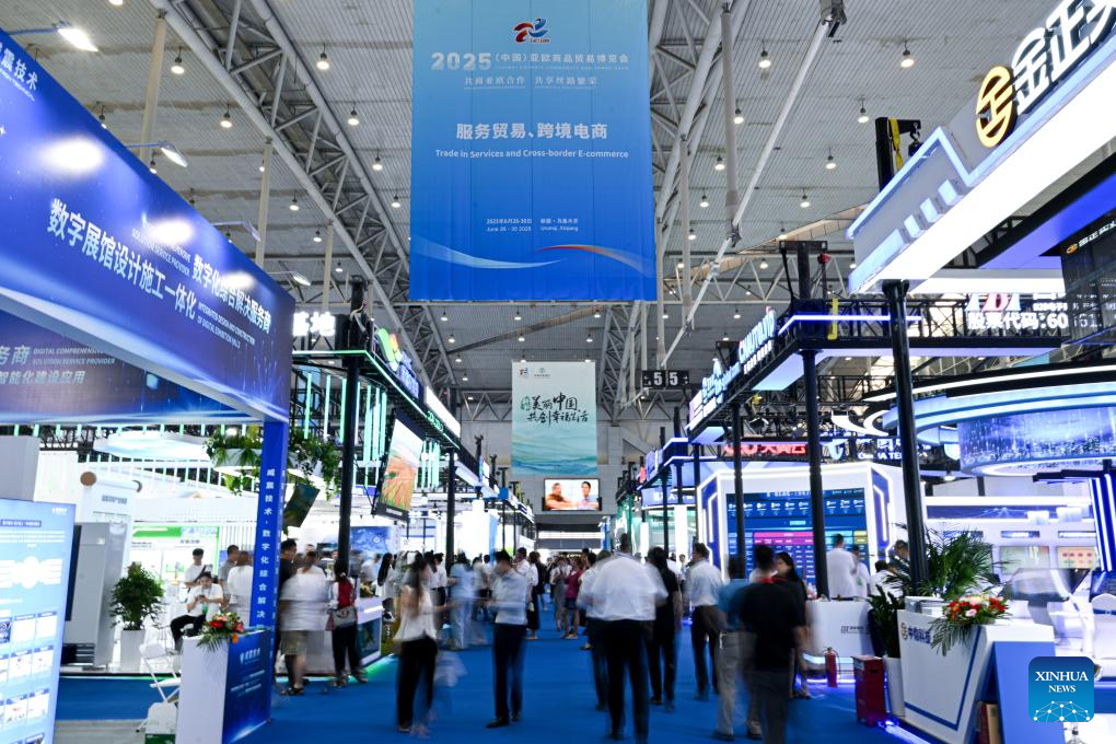 People visit the Trade in Services and Cross-border E-commerce sector during the 2025 (China) Eurasia Commodity and Trade Expo in Urumqi, northwest China's Xinjiang Uygur Autonomous Region, June 26, 2025.