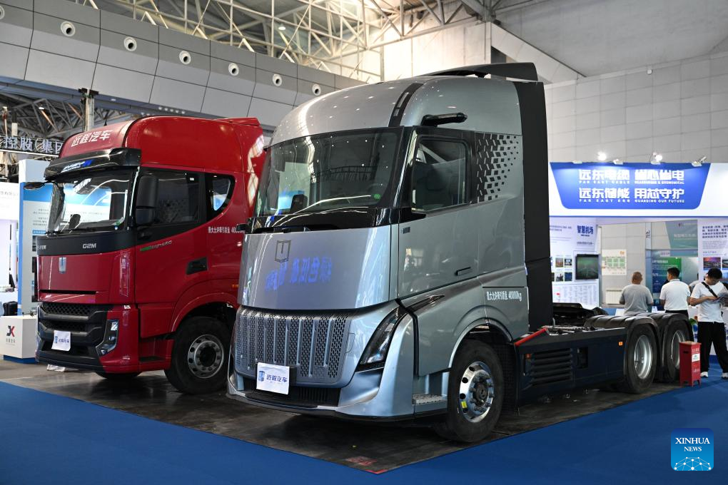 New energy tractor units are on display during the 2025 (China) Eurasia Commodity and Trade Expo in Urumqi, northwest China's Xinjiang Uygur Autonomous Region, June 26, 2025.
