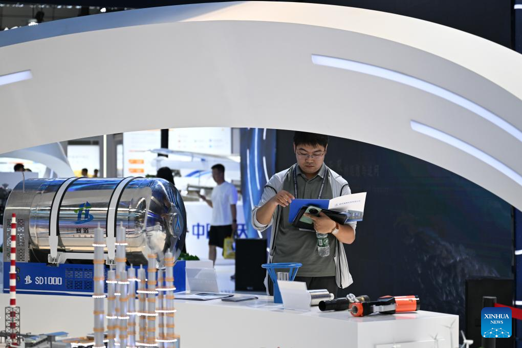 A visitor learns about products of China Aerospace Science and Technology Corporation during the 2025 (China) Eurasia Commodity and Trade Expo in Urumqi, northwest China's Xinjiang Uygur Autonomous Region, June 26, 2025.