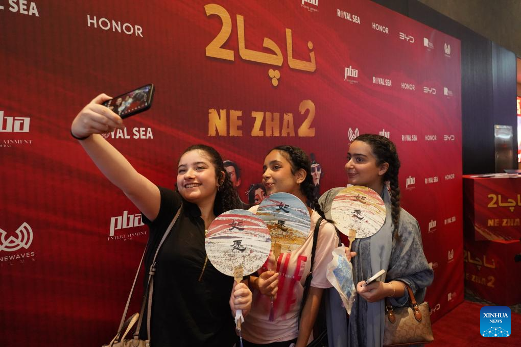 Girls take a selfie in front of a promotional display for the premiere of Chinese animated blockbuster "Ne Zha 2" in Riyadh, Saudi Arabia on June 25, 2025. (Xinhua/Luo Chen)