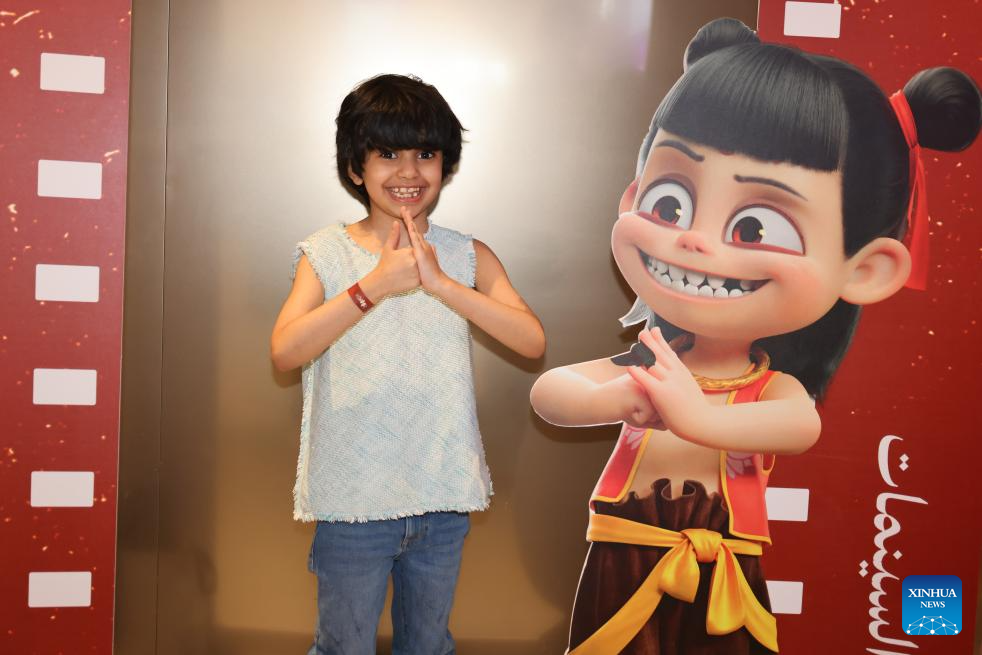 A boy poses for a photo with a promotional display for the premiere of Chinese animated blockbuster "Ne Zha 2" in Riyadh, Saudi Arabia on June 25, 2025. (Xinhua/Wang Haizhou)