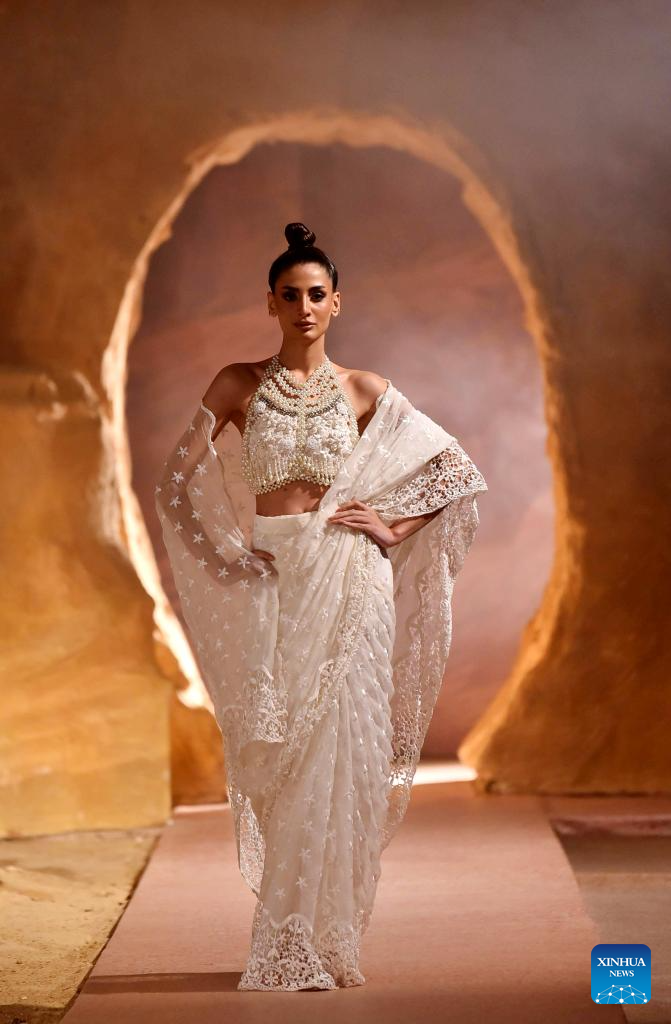 A model presents a creation during a fashion show in Karachi, southern Pakistan, on June 25, 2025. (Str/Xinhua)
