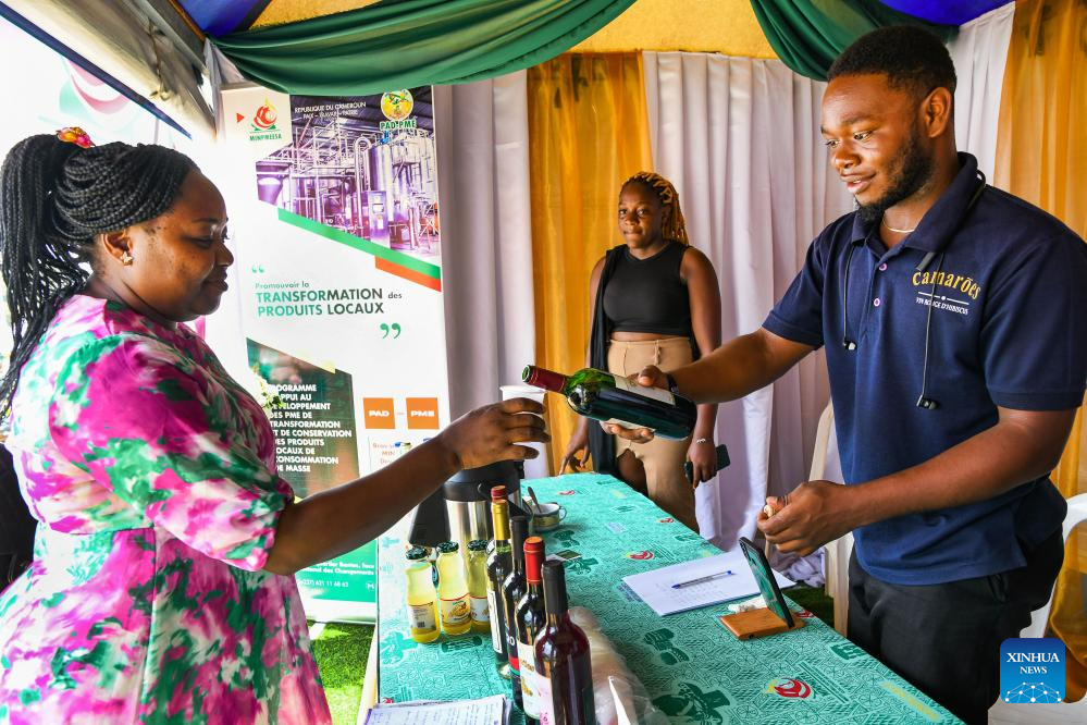 An exhibitor serves wine sample to a visitor during the 9th edition of the Yaounde International Agribusiness Exhibition (SIALY) in Yaounde, Cameroon, June 25, 2025. (Xinhua/Kepseu)