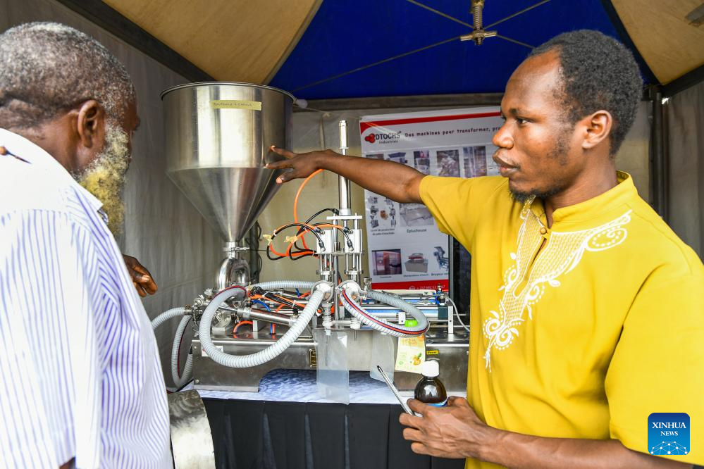 An exhibitor (R) introduces a juice processing machine to a visitor during the 9th edition of the Yaounde International Agribusiness Exhibition (SIALY) in Yaounde, Cameroon, June 25, 2025. (Xinhua/Kepseu)