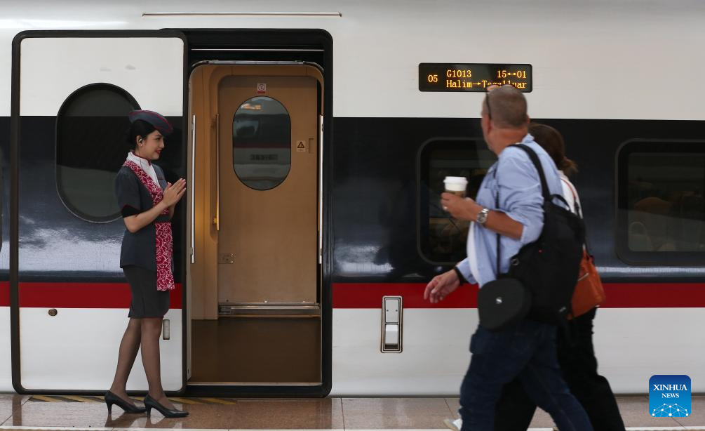 A cabin crew greets passengers at Halim Station in Jakarta, Indonesia, June 19, 2025. The Jakarta-Bandung High-Speed Railway (HSR) has transported more than 10 million passengers as of Wednesday since it began operations on Oct. 17, 2023, PT Kereta Cepat Indonesia-China (KCIC), a joint venture consortium between Indonesian and Chinese firms that constructs and operates the railway announced on Thursday. (Xinhua/Cen Yunpeng)