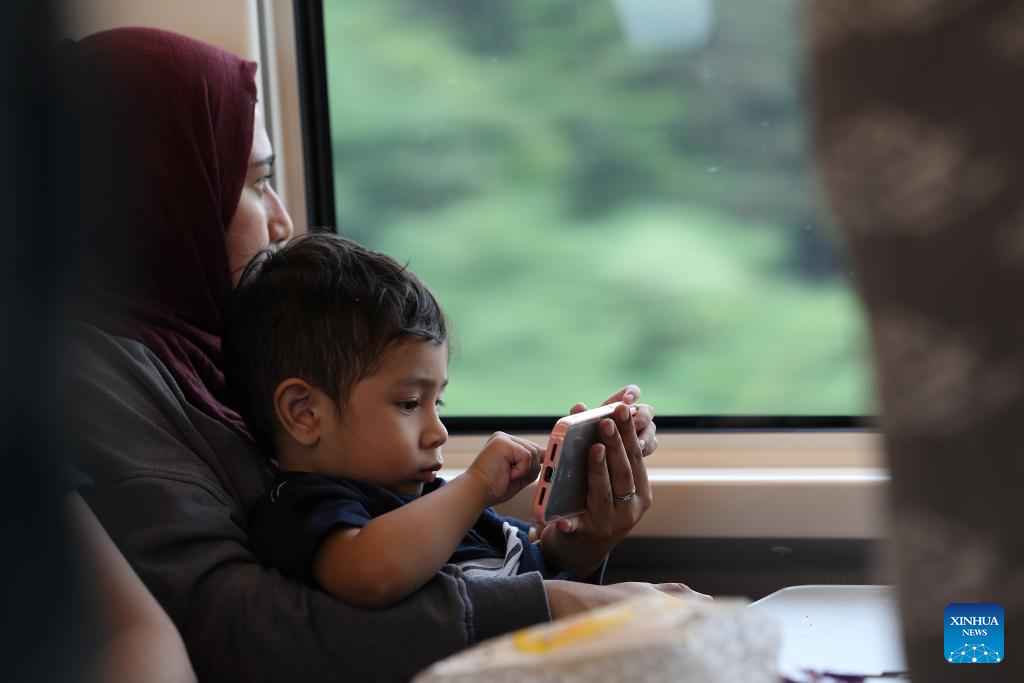 A passenger holding her baby is pictured on a running train on Jakarta-Bandung High-Speed Railway in Indonesia, June 19, 2025. The Jakarta-Bandung High-Speed Railway (HSR) has transported more than 10 million passengers as of Wednesday since it began operations on Oct. 17, 2023, PT Kereta Cepat Indonesia-China (KCIC), a joint venture consortium between Indonesian and Chinese firms that constructs and operates the railway announced on Thursday. (Xinhua/Cen Yunpeng)