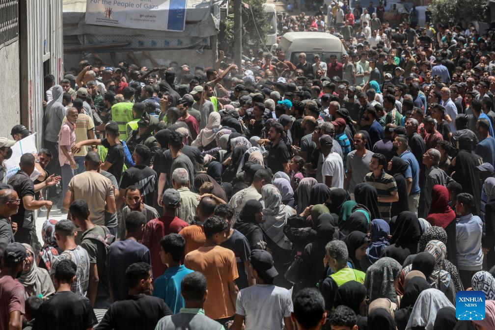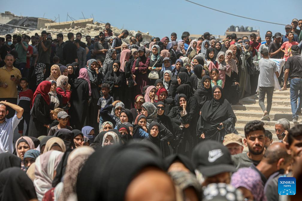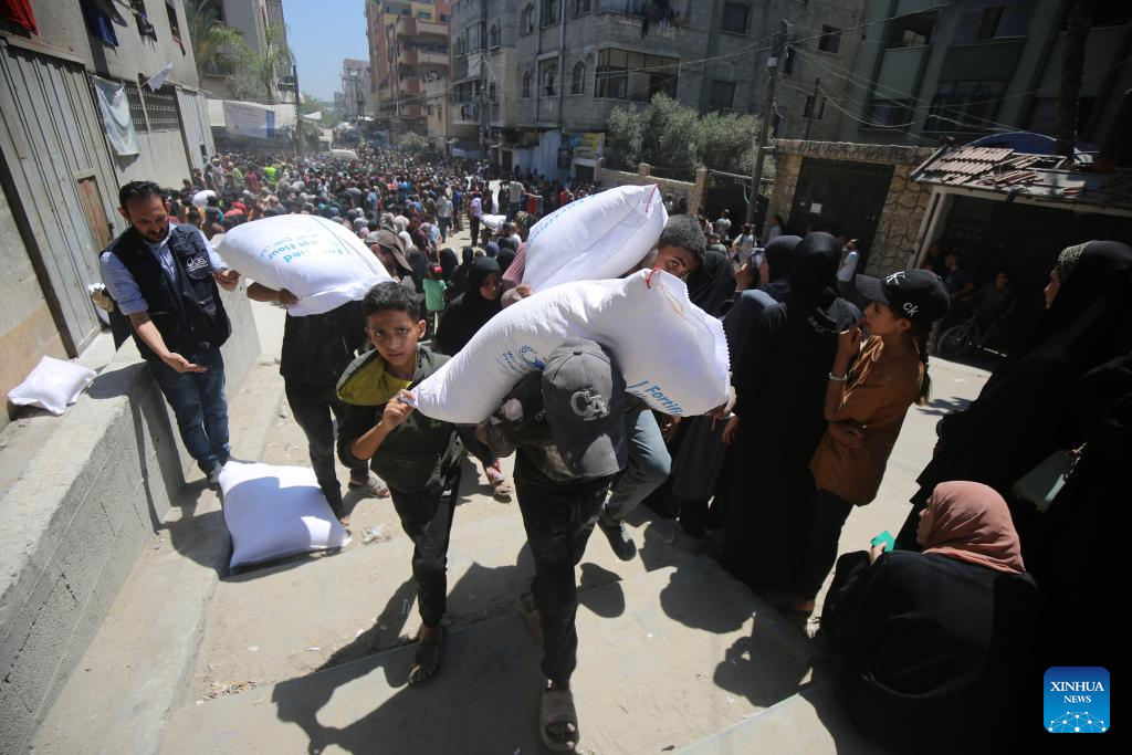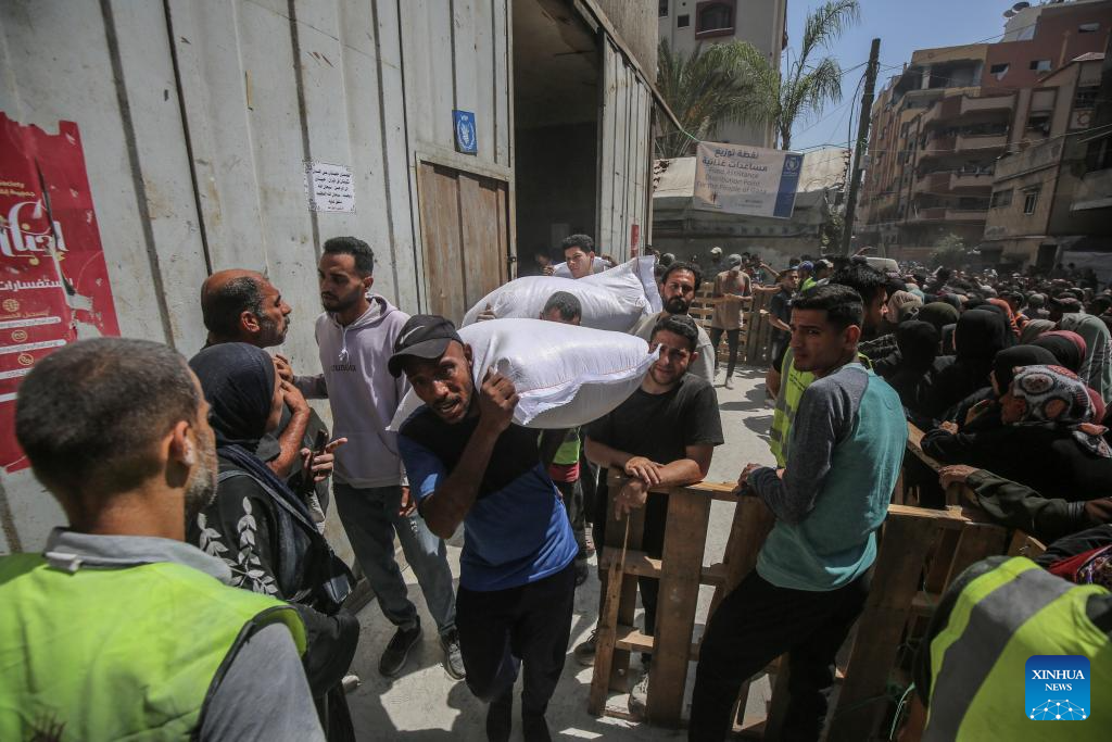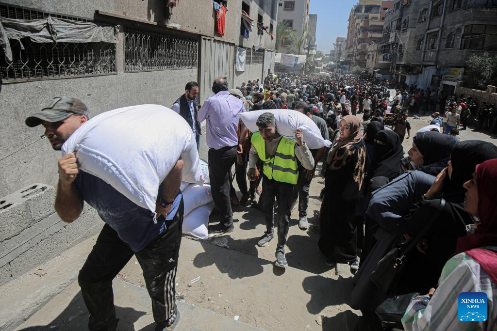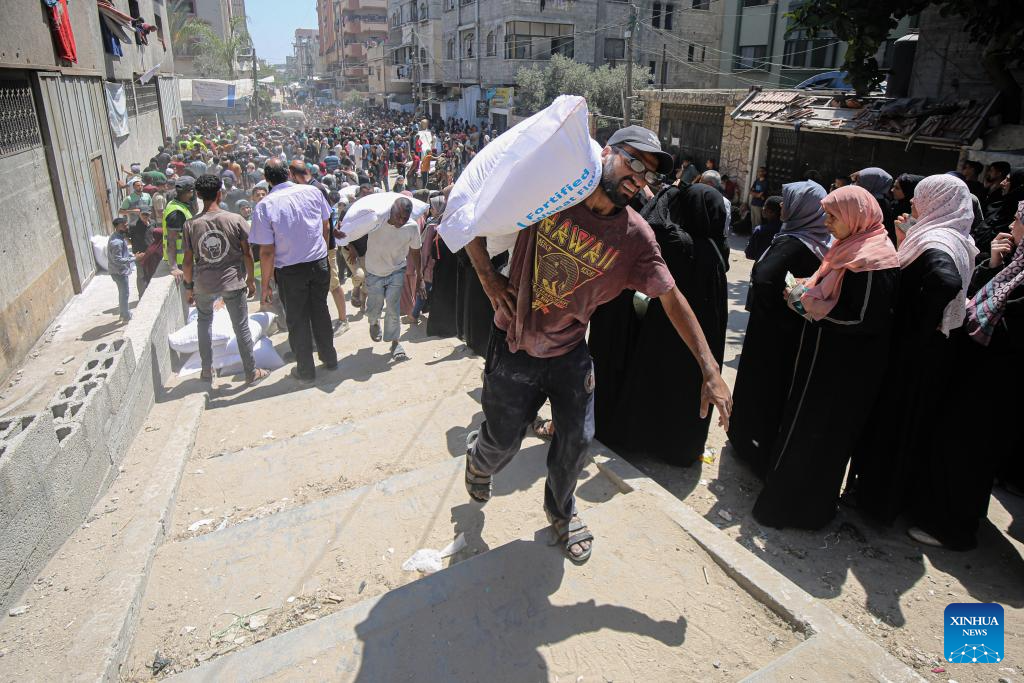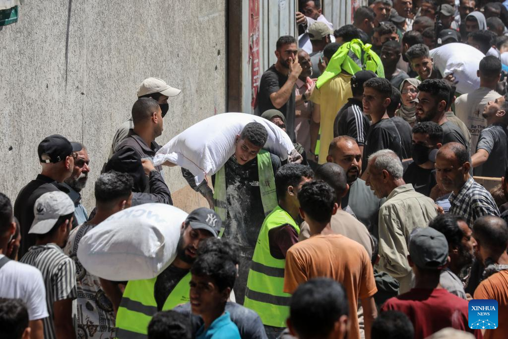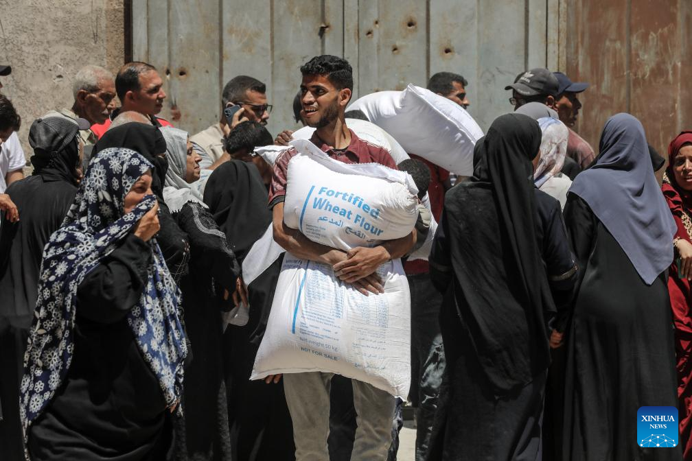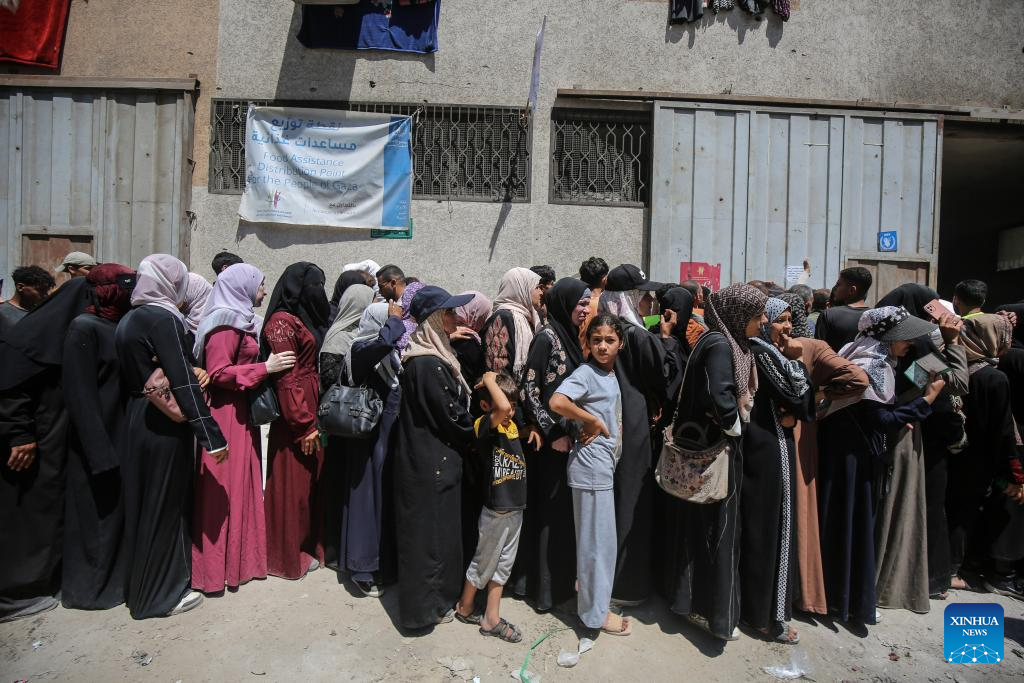Palestinians gather to receive food aid at a food assistance distribution point in Gaza City, on June 26, 2025. (Photo by Rizek Abdeljawad/Xinhua)