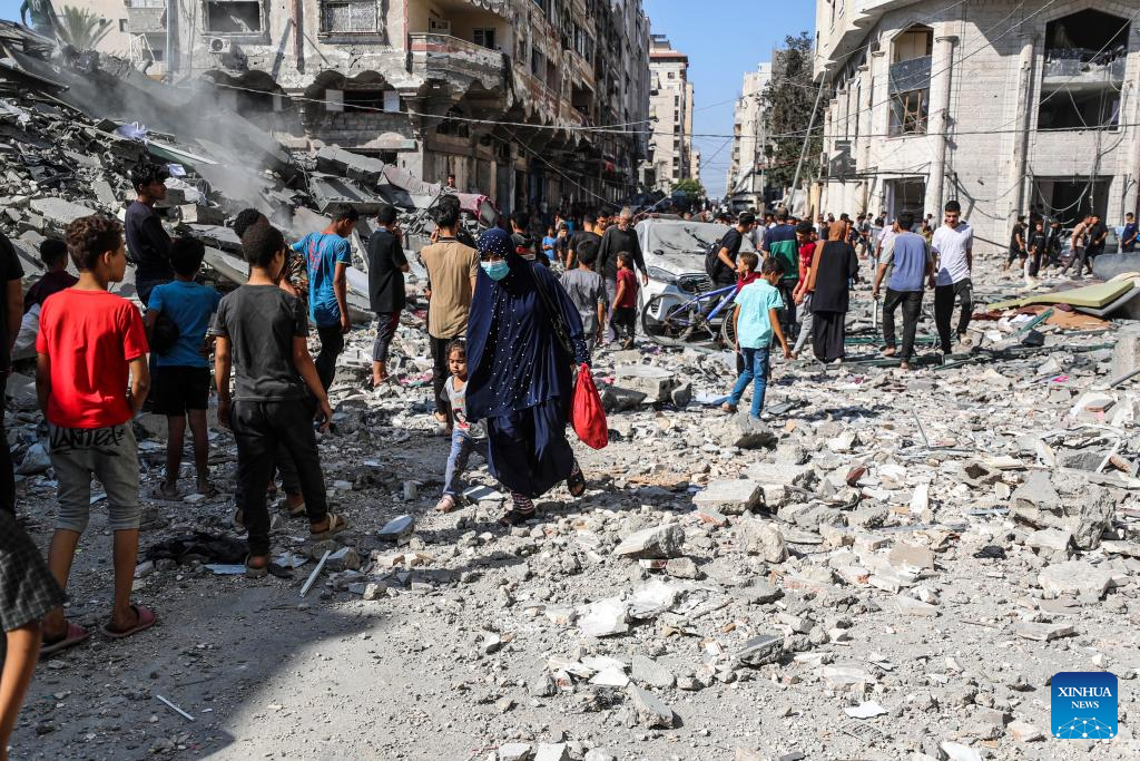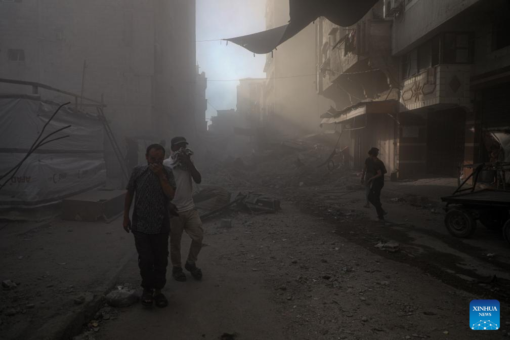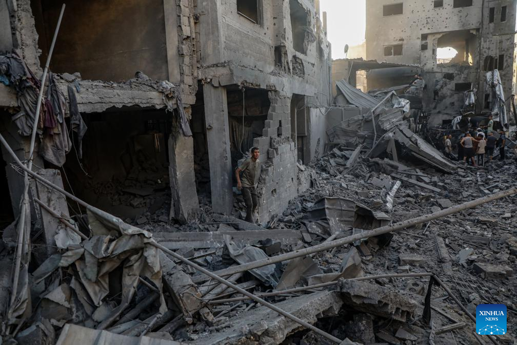 Palestinians are seen among the rubble of destroyed buildings after an Israeli airstrike in Gaza City, on June 27, 2025. At least 40 Palestinians were killed by Israeli gunfire and shelling across the Gaza Strip on Friday, Palestinian sources said. (Photo by Rizek Abdeljawad/Xinhua)