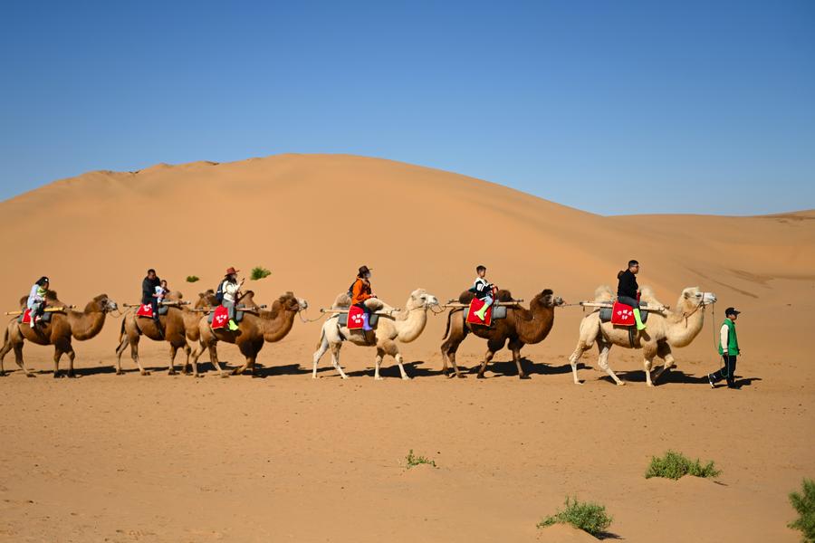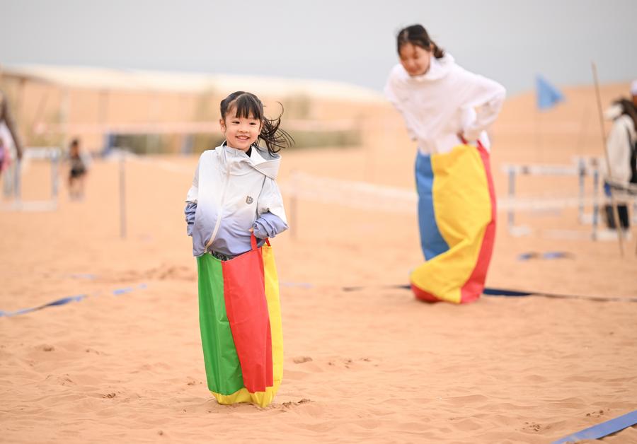 YINCHUAN, June 27 (Xinhua) -- In the blazing heat of June, tourists dash down sun-scorched dunes, ride camels on golden sands, and cool off in shimmering desert pools. Laughter, excitement and the hum of singing bowls fill the air.