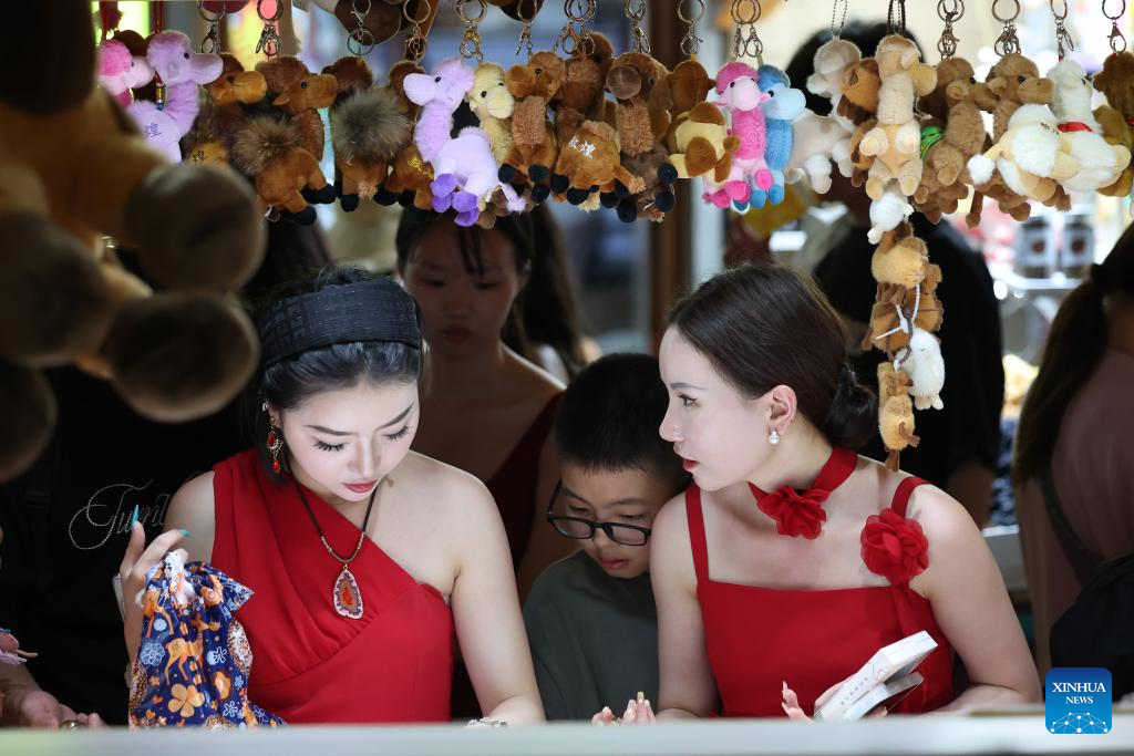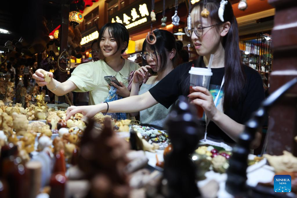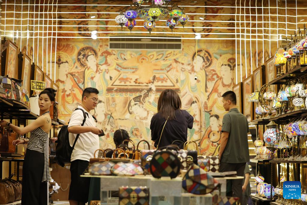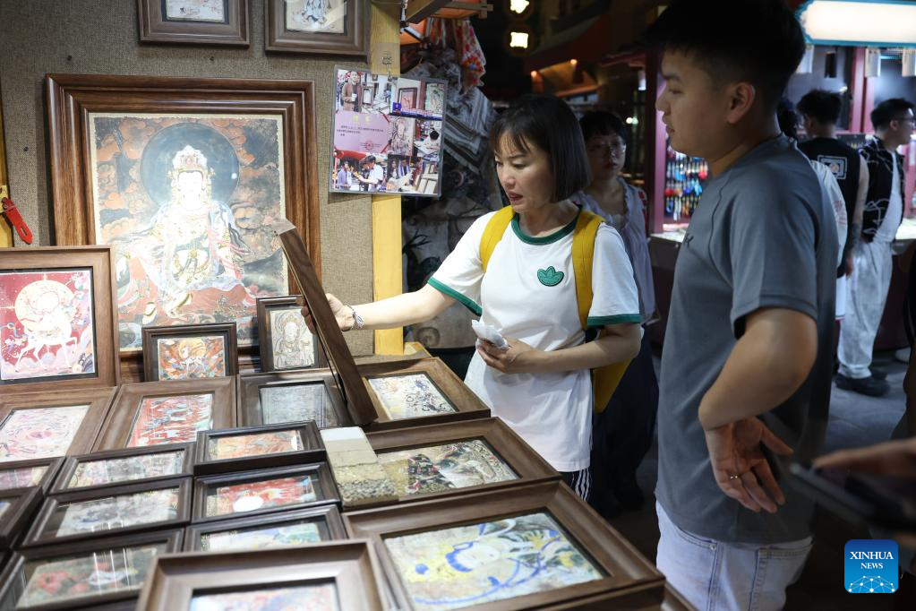 Tourists buy souvenirs at the night market in Dunhuang, northwest China's Gansu Province, June 26, 2025. Dunhuang has carried out a comprehensive upgrade of characteristic blocks such as the Dunhuang Night Market since the beginning of this year. By leveraging its profound history and culture, Dunhuang integrated mural and Silk Road culture elements into the renovation of the blocks, injecting new impetus into local night economy and tourism industry. (Xinhua/Chen Bin)