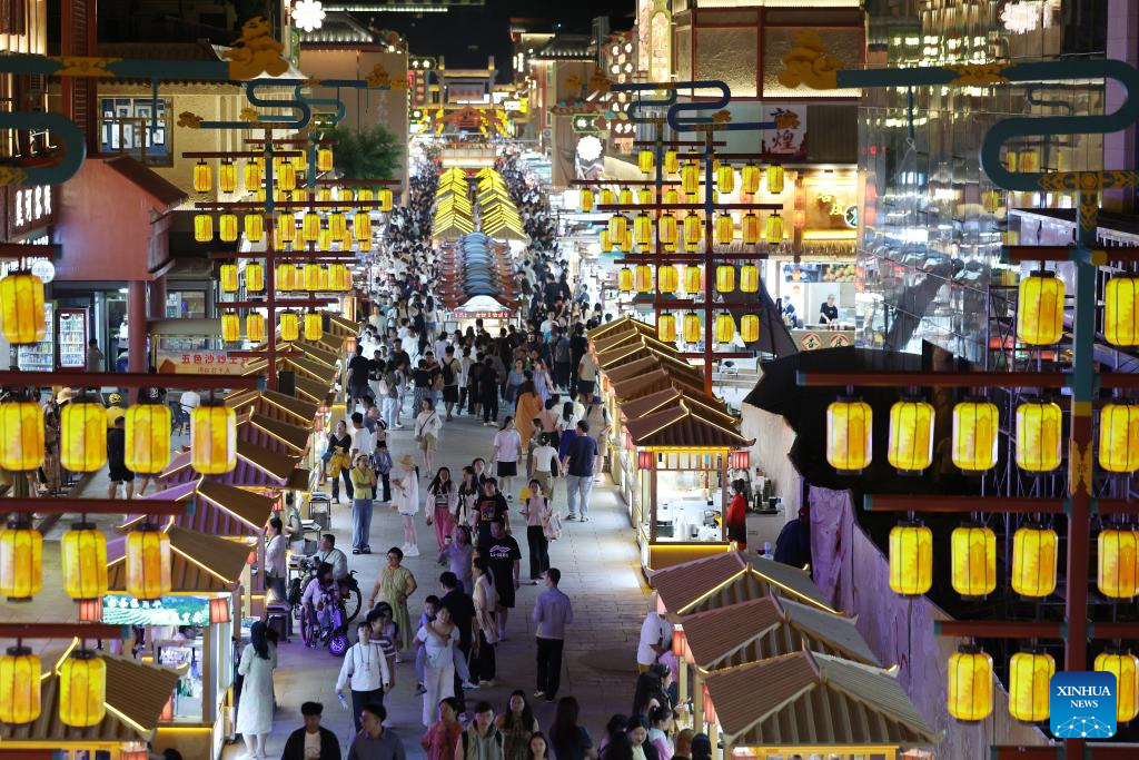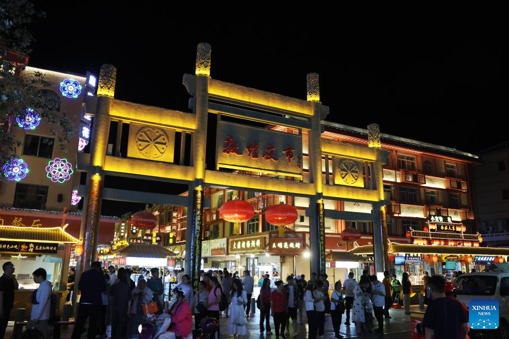 Tourists visit the night market in Dunhuang, northwest China's Gansu Province, June 26, 2025. Dunhuang has carried out a comprehensive upgrade of characteristic blocks such as the Dunhuang Night Market since the beginning of this year. By leveraging its profound history and culture, Dunhuang integrated mural and Silk Road culture elements into the renovation of the blocks, injecting new impetus into local night economy and tourism industry. (Xinhua/Chen Bin)