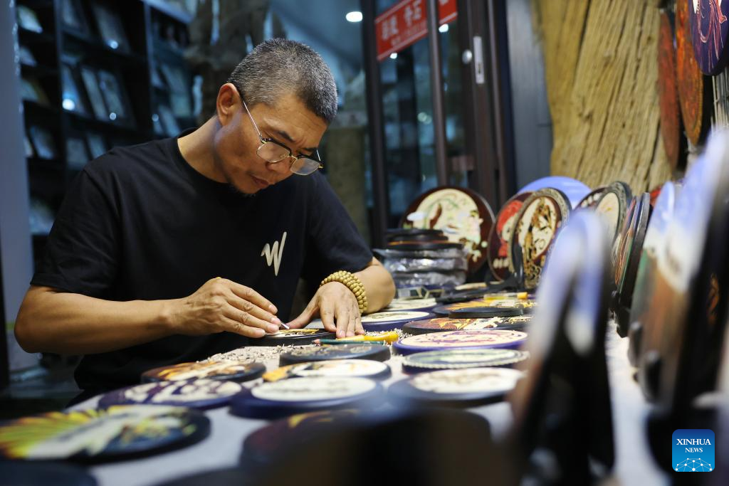 A vendor makes a cultural and creative product at the night market in Dunhuang, northwest China's Gansu Province, June 26, 2025. Dunhuang has carried out a comprehensive upgrade of characteristic blocks such as the Dunhuang Night Market since the beginning of this year. By leveraging its profound history and culture, Dunhuang integrated mural and Silk Road culture elements into the renovation of the blocks, injecting new impetus into local night economy and tourism industry. (Xinhua/Chen Bin)