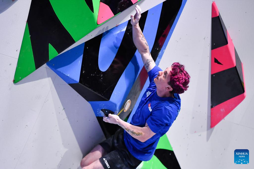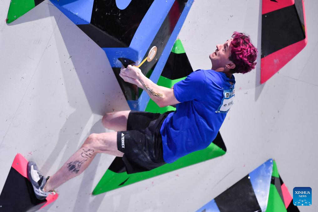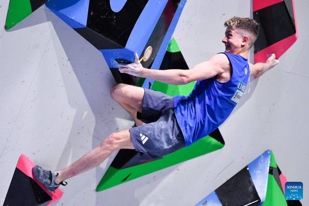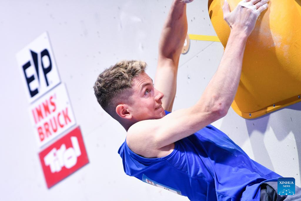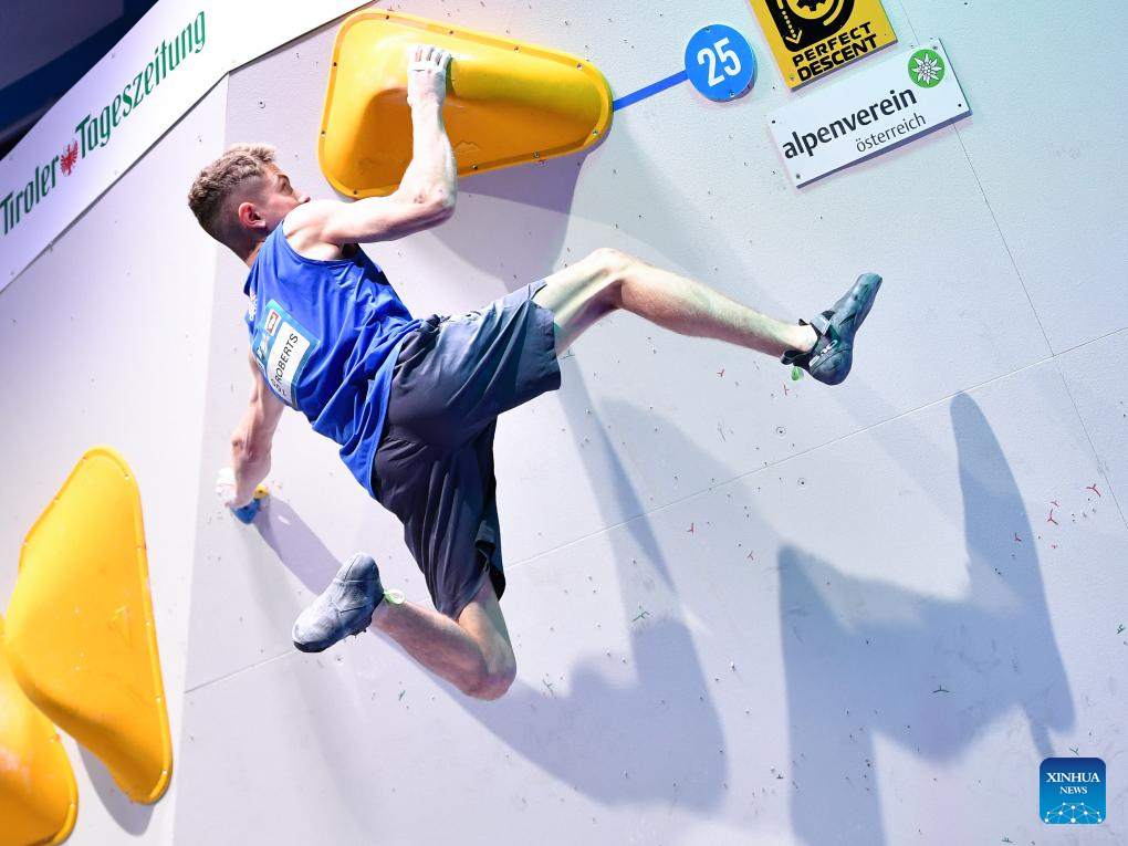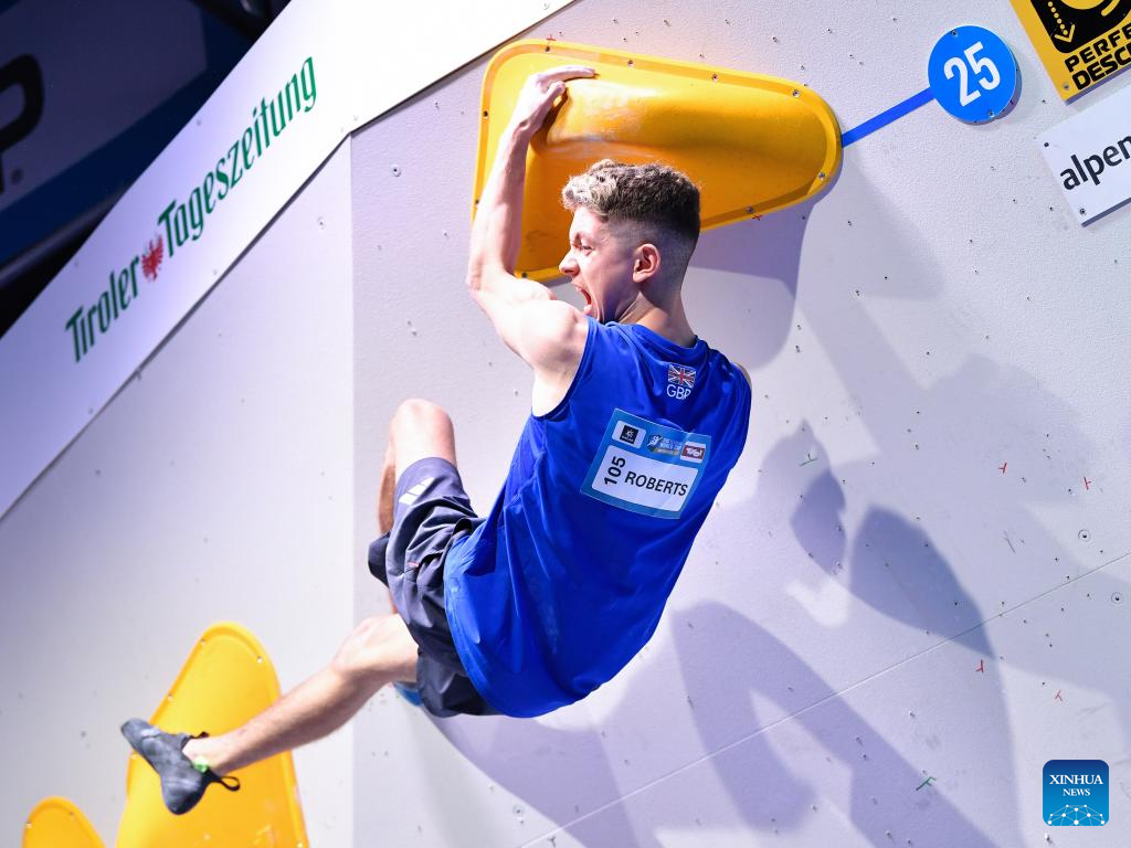 Toby Roberts of Britain competes during the men's boulder final at the International Federation of Sport Climbing (IFSC) World Cup in Innsbruck, Austria, June 26, 2025. (Xinhua/Lian Yi)