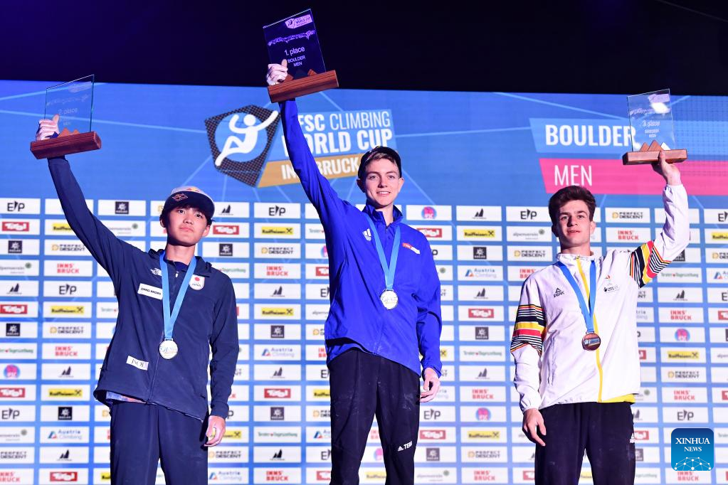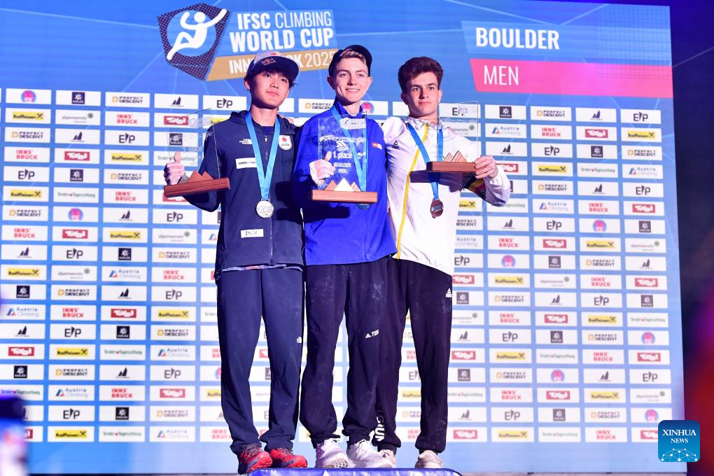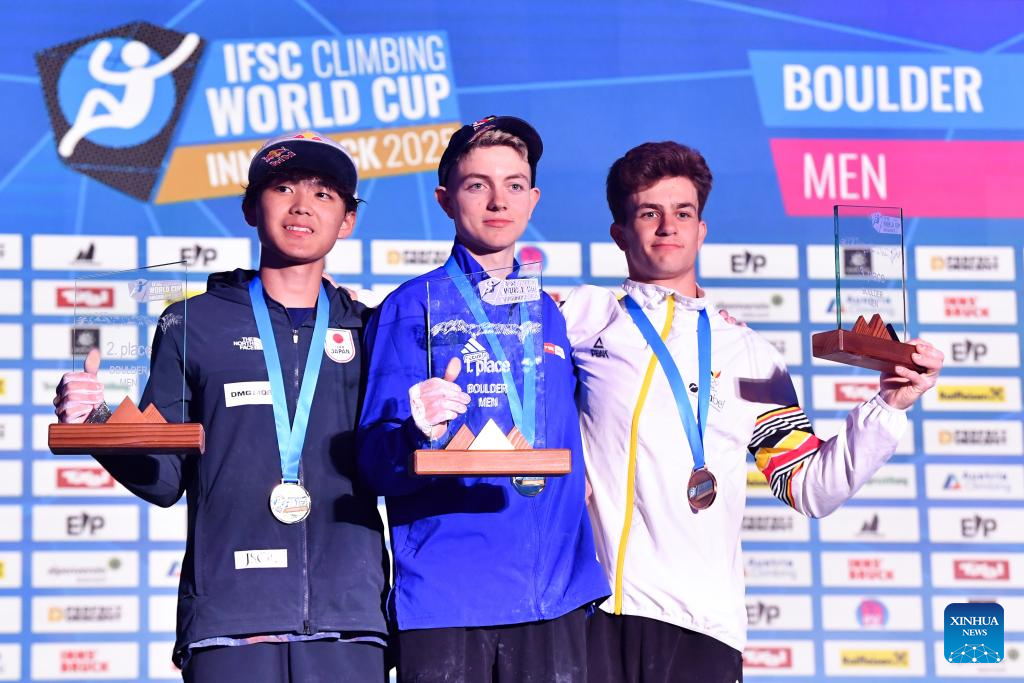 Gold medalist Toby Roberts (C) of Britain, silver medalist Sorato Anraku (L) of Japan, and bronze medalist Hannes Van Duysen of Belgium react during the awarding ceremony for the men's boulder final at the International Federation of Sport Climbing (IFSC) World Cup in Innsbruck, Austria, June 26, 2025. (Xinhua/Lian Yi)