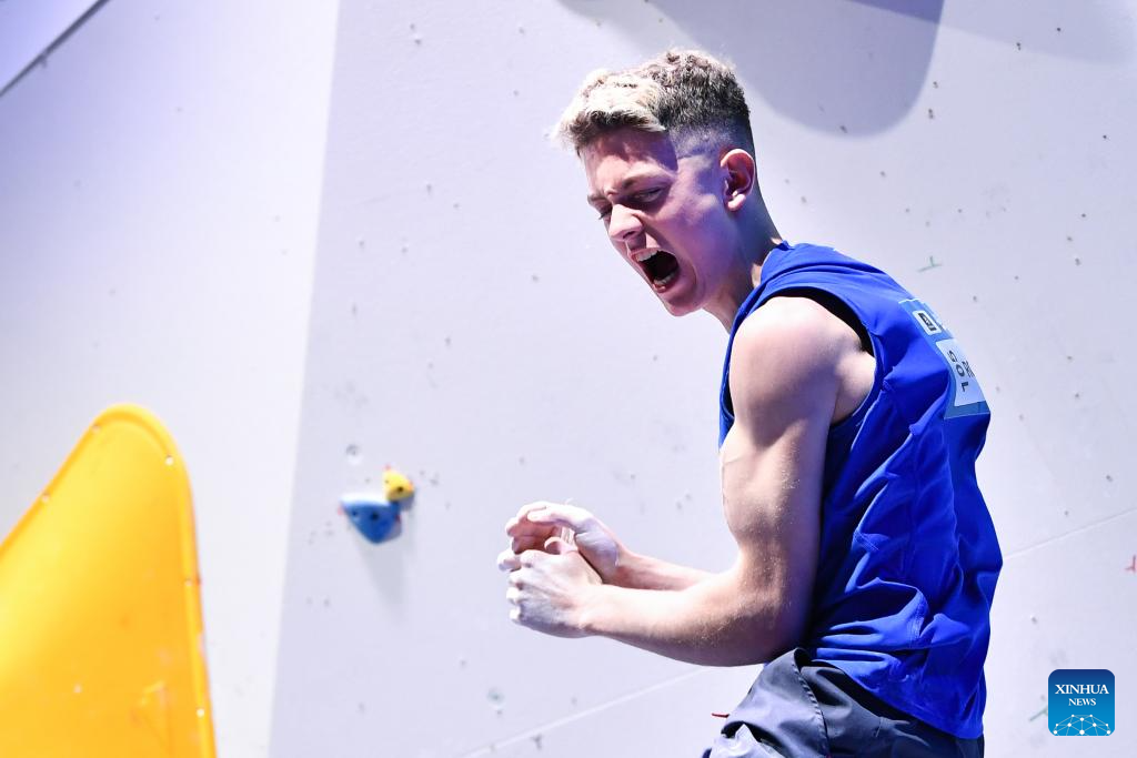 Toby Roberts of Britain reacts during the men's boulder final at the International Federation of Sport Climbing (IFSC) World Cup in Innsbruck, Austria, June 26, 2025. (Xinhua/Lian Yi)