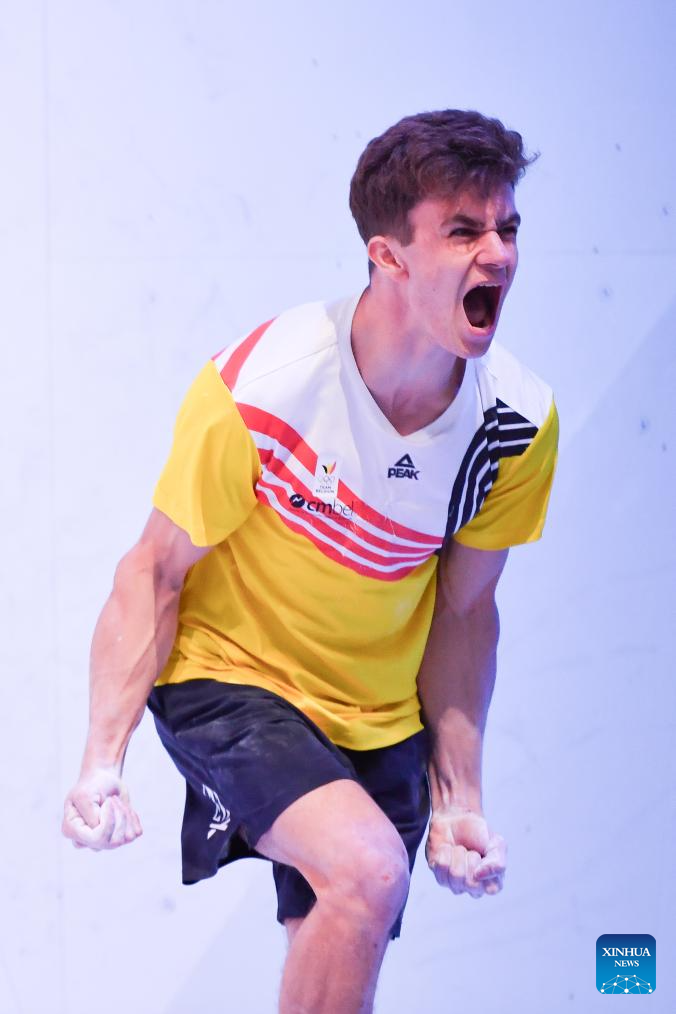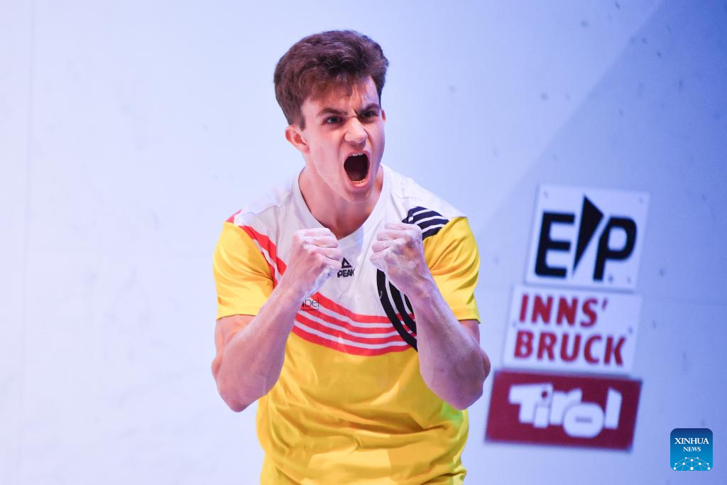 Hannes Van Duysen of Belgium reacts during the men's boulder final at the International Federation of Sport Climbing (IFSC) World Cup in Innsbruck, Austria, June 26, 2025. (Xinhua/Lian Yi)