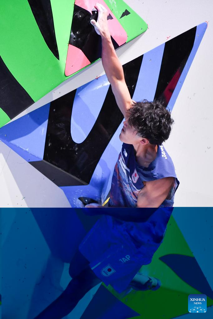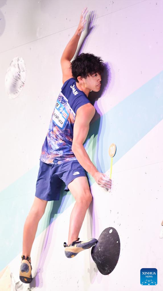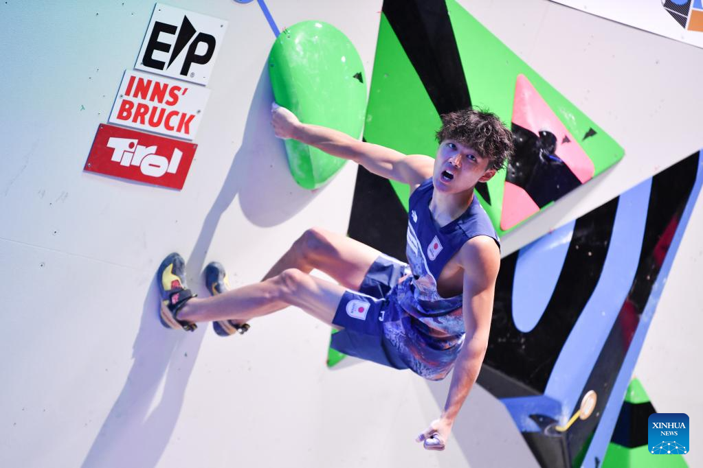 Sorato Anraku of Japan competes during the men's boulder final at the International Federation of Sport Climbing (IFSC) World Cup in Innsbruck, Austria, June 26, 2025. (Xinhua/Lian Yi)