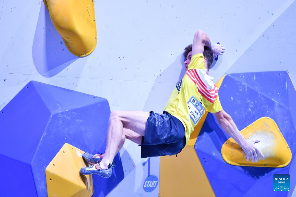 Hannes Van Duysen of Belgium competes during the men's boulder final at the International Federation of Sport Climbing (IFSC) World Cup in Innsbruck, Austria, June 26, 2025. (Xinhua/Lian Yi)