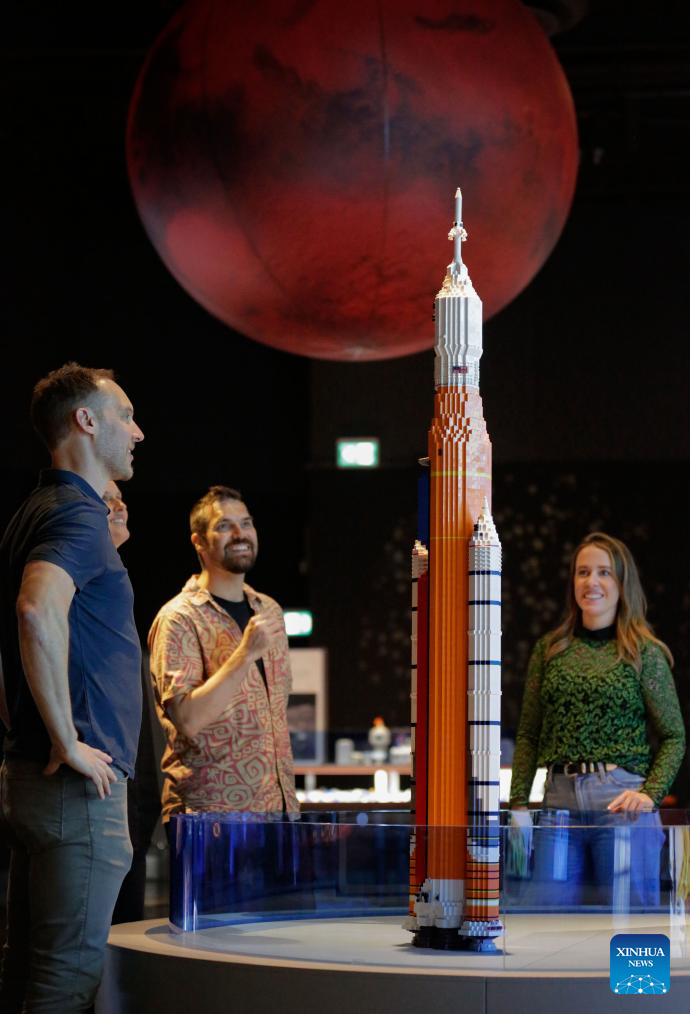 Visitors look at a LEGO model of the Artemis program's moon rocket during the "Artemis Space Adventure with LEGO Bricks" exhibition at Science World in Vancouver, British Columbia, Canada, June 26, 2025. The exhibition kicked off here on Thursday and runs until April 6, 2026. (Photo by Harrison Ha/Xinhua)