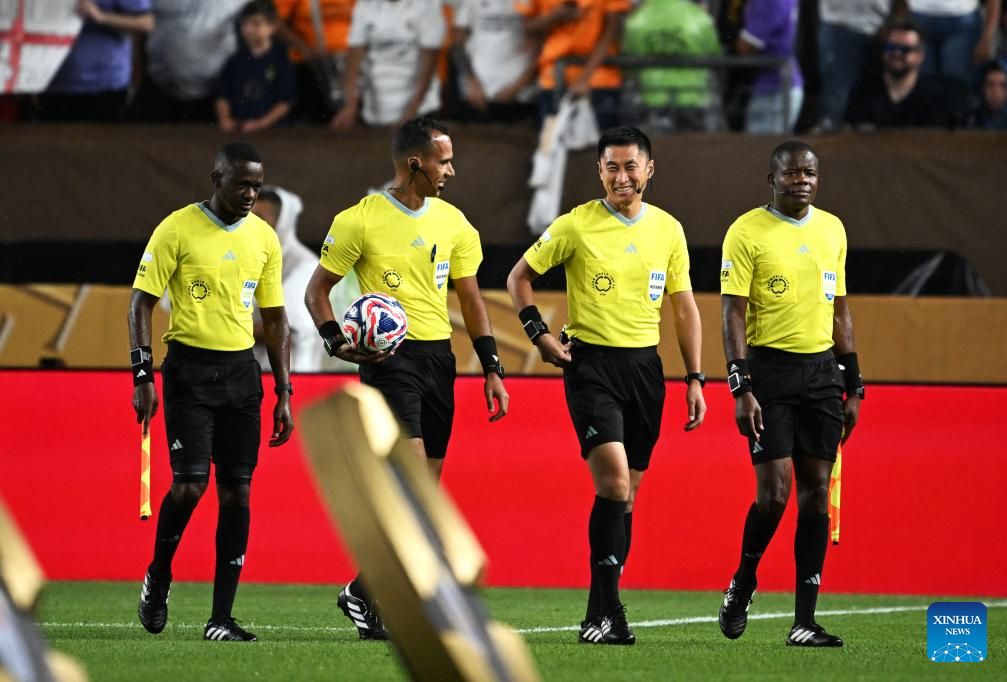 Referee Dahane Beida (2nd L) and fourth official Ma Ning (2nd R) enter the field before the group H football match between Spain's Real Madrid and Austria's Red Bull Salzburg at the FIFA Club World Cup 2025 in Philadelphia, the United States, June 26, 2025. (Xinhua/Wu Xiaoling)