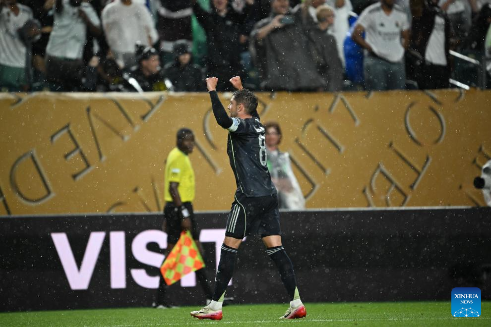 Federico Valverde of Real Madrid celebrates scoring during the group H football match between Spain's Real Madrid and Austria's Red Bull Salzburg at the FIFA Club World Cup 2025 in Philadelphia, the United States, June 26, 2025. (Xinhua/Wu Xiaoling)