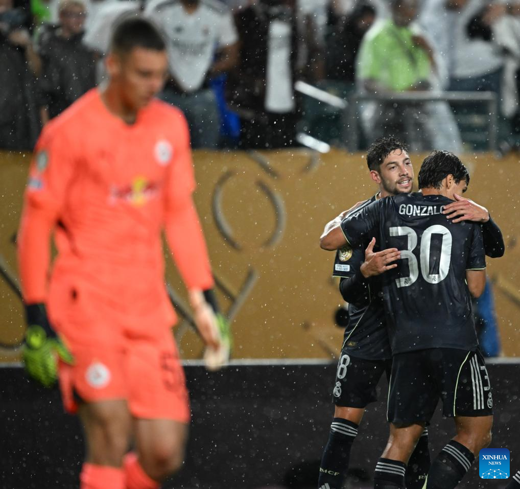 Federico Valverde (2nd R) of Real Madrid celebrates scoring with his teammate Gonzalo Garcia (1st R) during the group H football match between Spain's Real Madrid and Austria's Red Bull Salzburg at the FIFA Club World Cup 2025 in Philadelphia, the United States, June 26, 2025. (Xinhua/Wu Xiaoling)