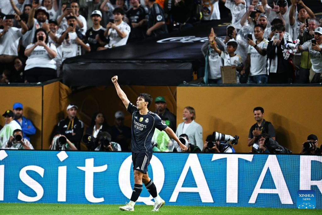 Gonzalo Garcia of Real Madrid celebrates scoring during the group H football match between Spain's Real Madrid and Austria's Red Bull Salzburg at the FIFA Club World Cup 2025 in Philadelphia, the United States, June 26, 2025. (Xinhua/Wu Xiaoling)