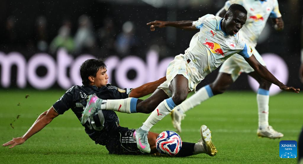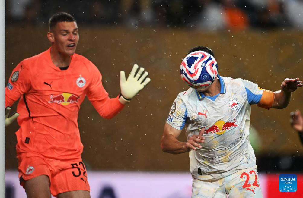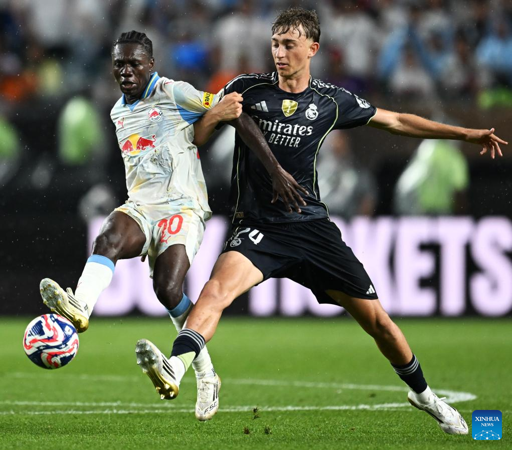 Stefan Lainer (R) of Red Bull Salzburg competes during the group H football match between Spain's Real Madrid and Austria's Red Bull Salzburg at the FIFA Club World Cup 2025 in Philadelphia, the United States, June 26, 2025. (Xinhua/Wu Xiaoling)