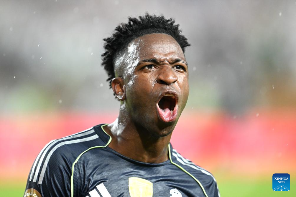 Vinicius Junior of Real Madrid celebrates scoring during the group H football match between Spain's Real Madrid and Austria's Red Bull Salzburg at the FIFA Club World Cup 2025 in Philadelphia, the United States, June 26, 2025. (Xinhua/Wu Xiaoling)
