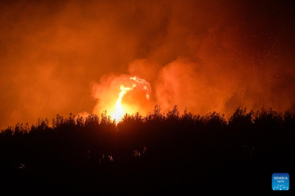 This photo taken on June 26, 2025 shows a forest fire that broke out on Wednesday afternoon in Türkiye's western province of Izmir, with firefighting efforts continuing on Thursday. (Mustafa Kaya/Handout via Xinhua)