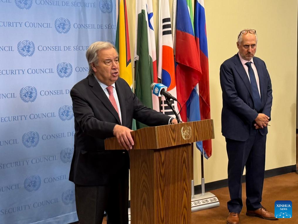 UN Secretary-General Antonio Guterres (L) speaks to the press outside the Security Council Chamber at the UN headquarters in New York, on June 27, 2025. Guterres on Friday called for a ceasefire in Gaza following the suspension of the 12-day war between Israel and Iran. (Photo by William Reilly/Xinhua)