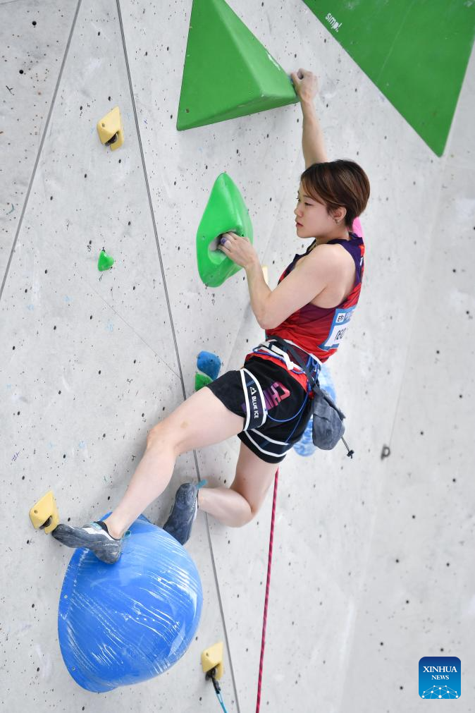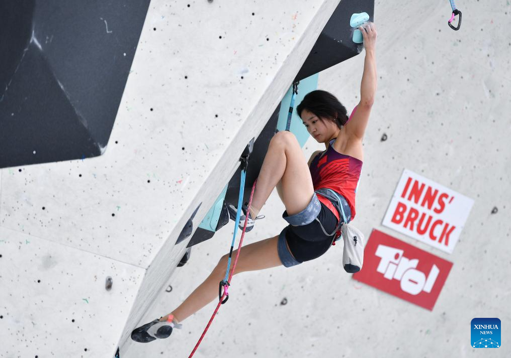 Wei Yali of China competes during the women's lead qualification at the International Federation of Sport Climbing (IFSC) World Cup in Innsbruck, Austria, June 28, 2025. (Xinhua/Lian Yi)