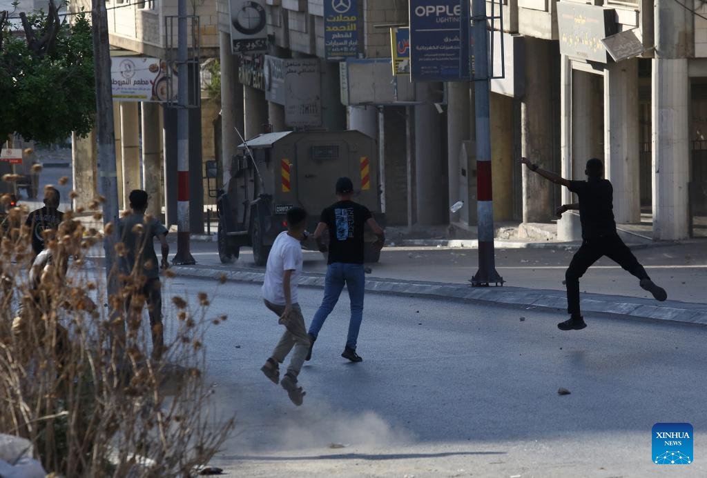 Palestinian protesters throw stones during clashes with Israeli soldiers in the West Bank city of Nablus, on June 27, 2025. (Photo by Nidal Eshtayeh/Xinhua)