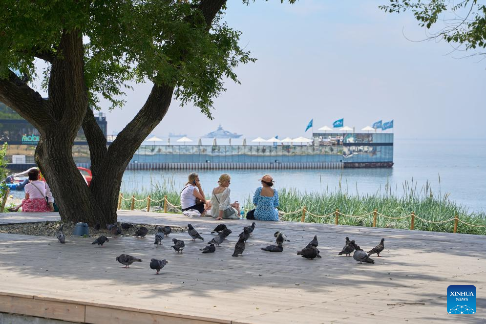 Local residents relax at the beach to escape the heat in Vladivostok, Russia, June 27, 2025. Vladivostok experienced a severe heat wave on Friday. (Photo by Guo Feizhou/Xinhua)