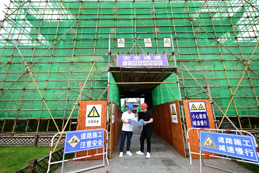 A drone photo taken on June 19, 2025 shows the maintenance project of a watch tower in the Huizhou ancient town in Shexian County, east China's Anhui Province. (Xinhua/Zhou Mu)