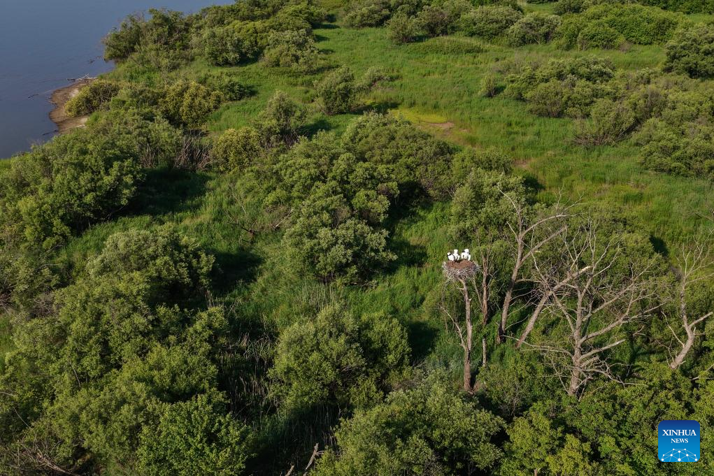 An aerial drone photo taken on June 24, 2025 shows oriental white stork chicks at the Bachadao National Nature Reserve in Tongjiang, northeast China's Heilongjiang Province. As summer progresses, the breeding season of oriental white storks is gradually coming to an end. The growing chicks begin to learn how to fly under the guidance of their parents.