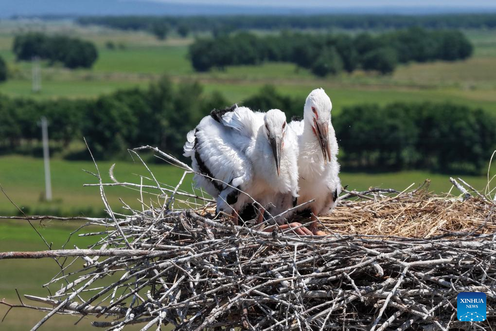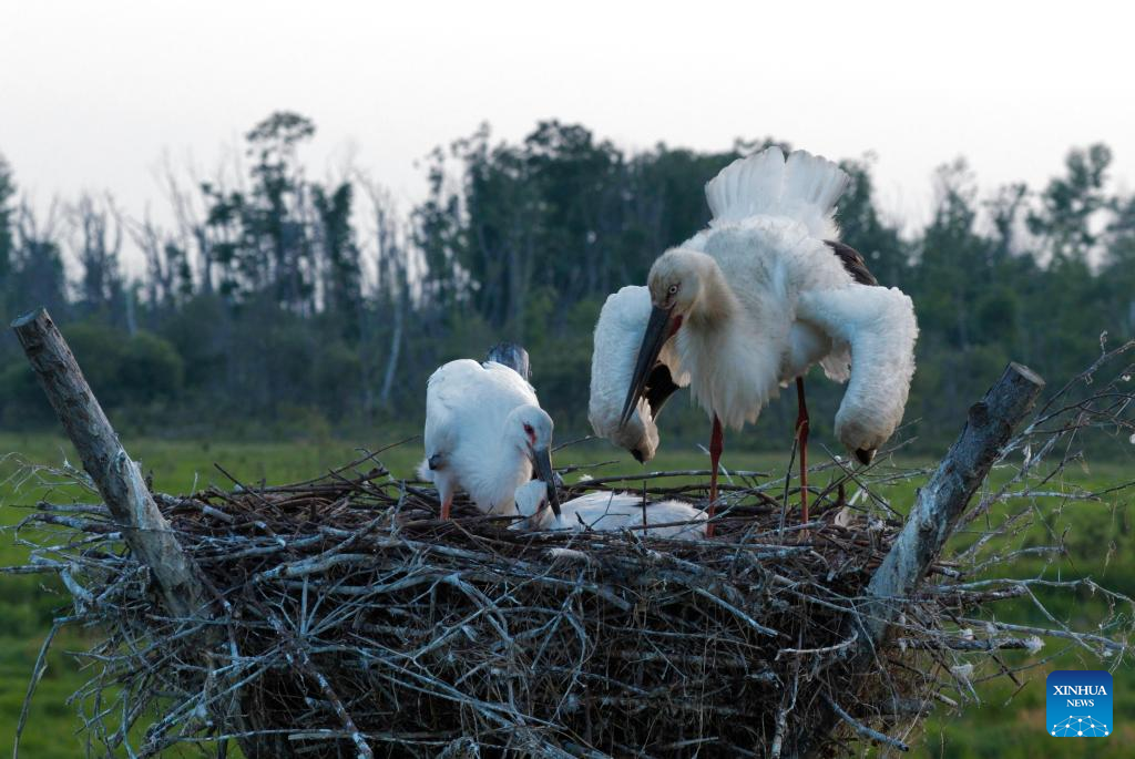 An oriental white stork family is seen at the Zhalong National Nature Reserve in Qiqihar, northeast China's Heilongjiang Province, June 9, 2025. As summer progresses, the breeding season of oriental white storks is gradually coming to an end. The growing chicks begin to learn how to fly under the guidance of their parents.