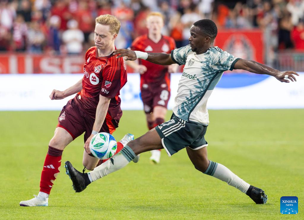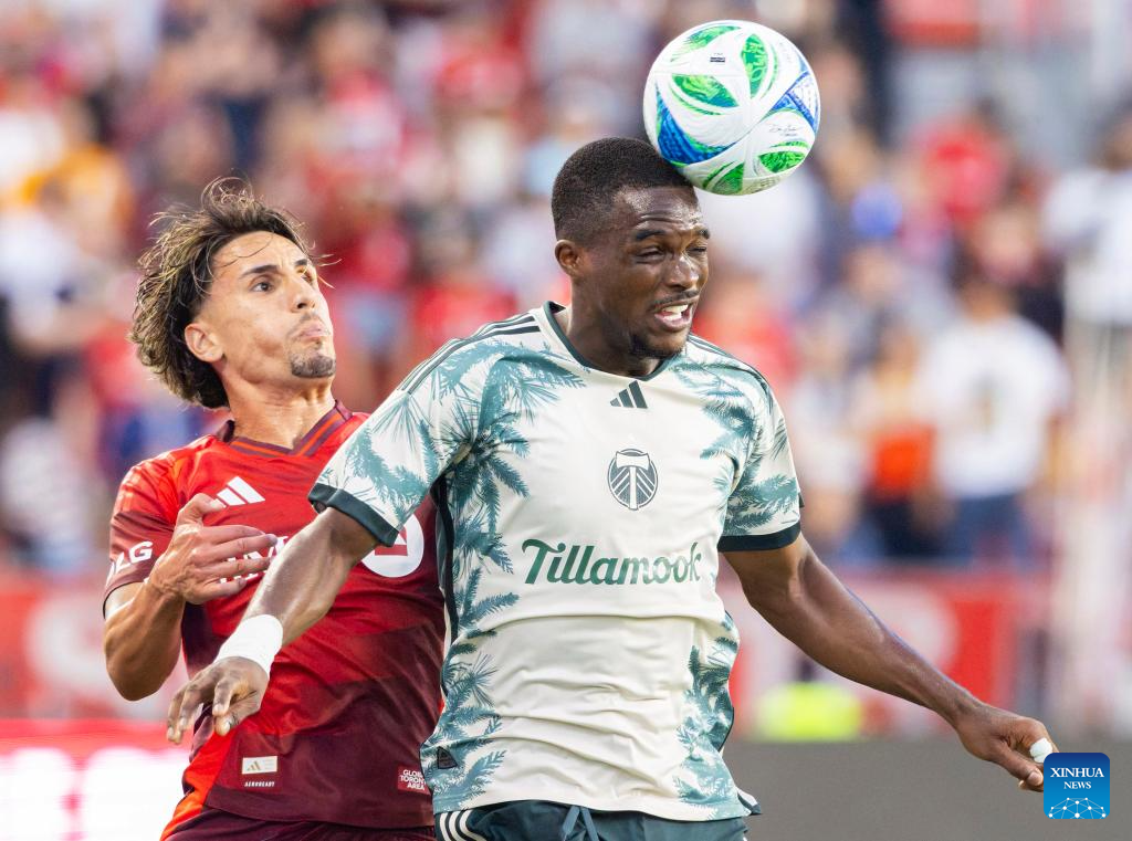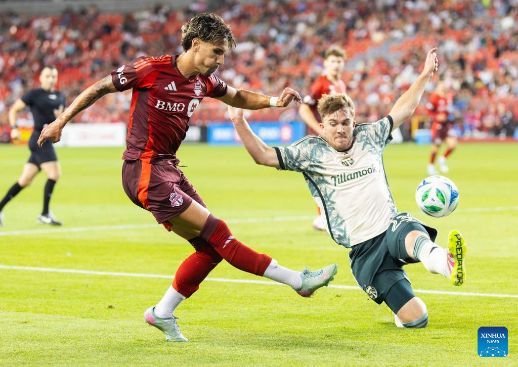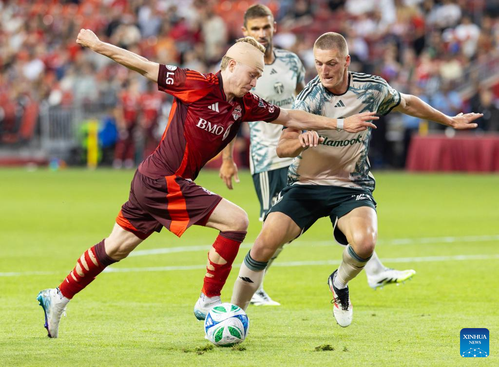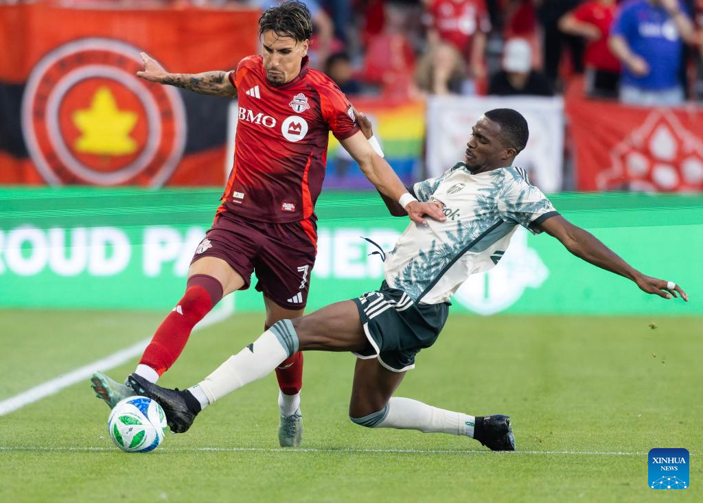 Ian Smith (R) of Portland Timbers vies with Theo Corbeanu of Toronto FC during the 2025 Major League Soccer(MLS) regular season match between Toronto FC and Portland Timbers at BMO Field in Toronto, Canada, on June 28, 2025. (Photo by Zou Zheng/Xinhua)