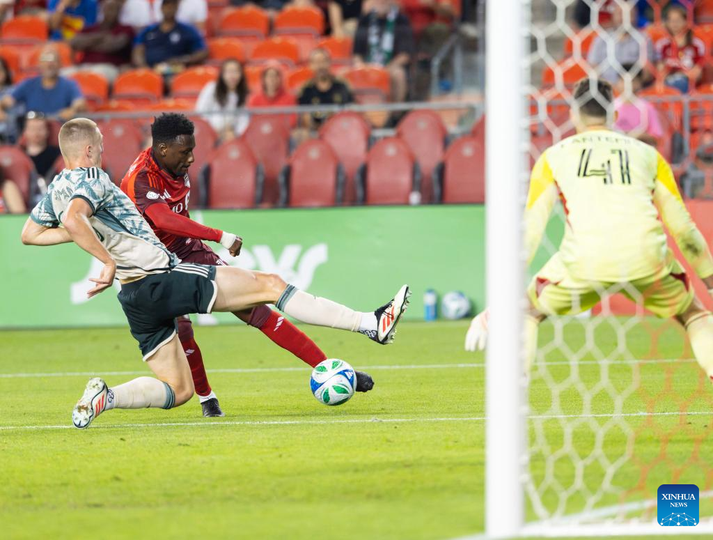 Derrick Etienne Jr. (2nd L) of Toronto FC shoots during the 2025 Major League Soccer(MLS) regular season match between Toronto FC and Portland Timbers at BMO Field in Toronto, Canada, on June 28, 2025. (Photo by Zou Zheng/Xinhua)
