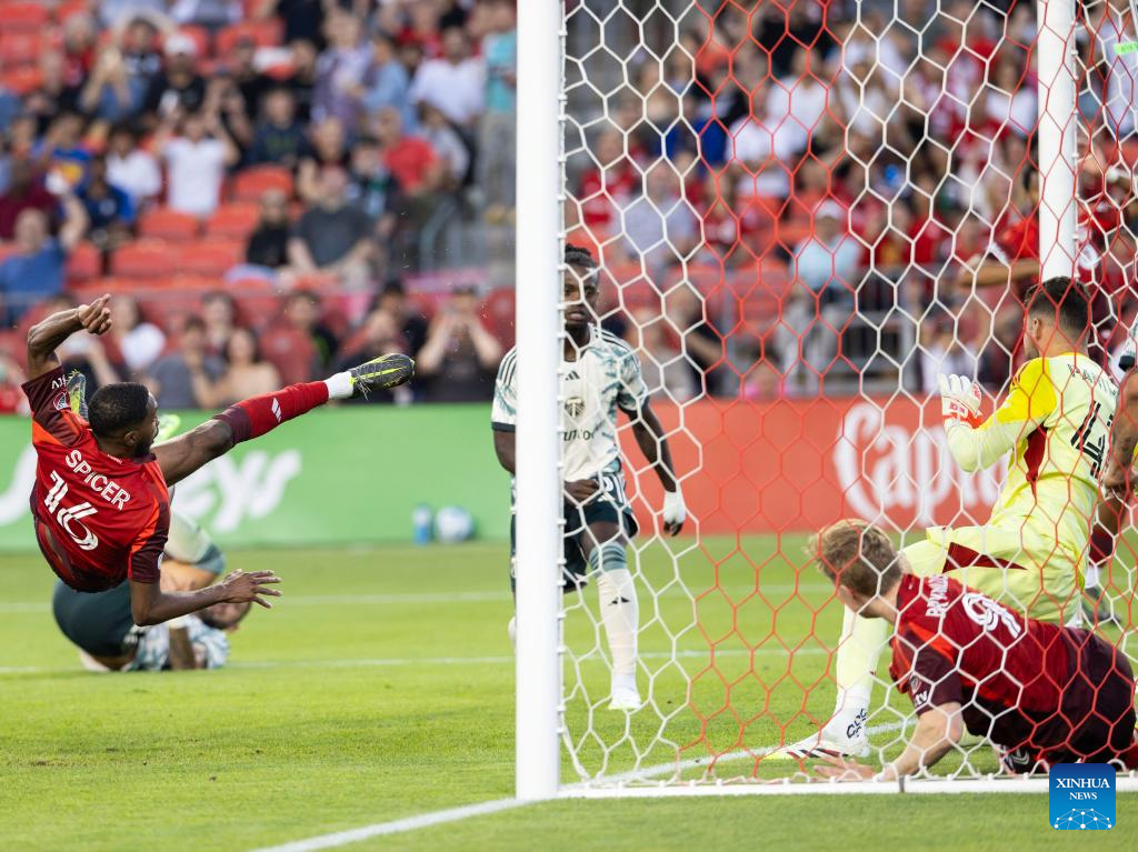 Tyrese Spicer (L) of Toronto FC shoots to score during the 2025 Major League Soccer(MLS) regular season match between Toronto FC and Portland Timbers at BMO Field in Toronto, Canada, on June 28, 2025. (Photo by Zou Zheng/Xinhua)